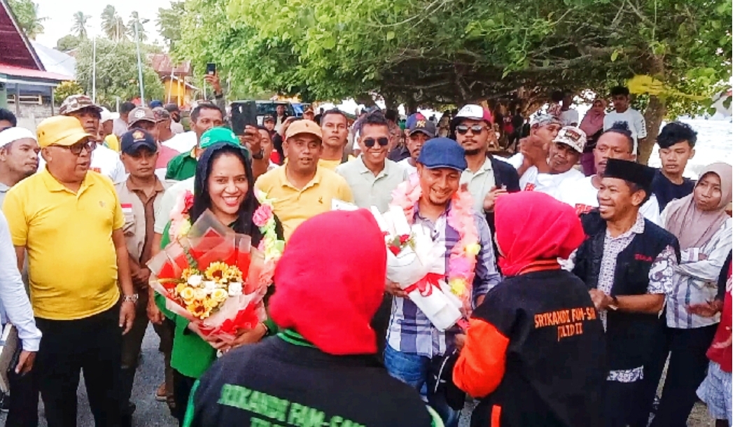 SANANA-Kedatangan Pasangan Calon (Paslon) Bupati dan Wakil Bupati Kepulauan Sula nomor urut 2, Fifian Adeningsi Mus dan M. Saleh Marasabessy didampingi Partai koalisi serta simpatisan, disambut penuh antusias oleh warga Desa Waitulia, Kecamatan Mangoli Tengah. Senin, (21/10/2024).