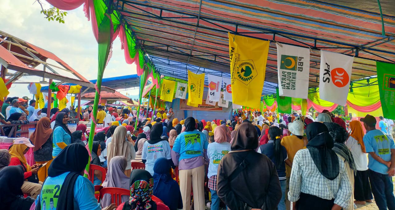 SANANA-Simpatisan Pasangan Calon (Paslon) Bupati dan Wakil Bupati Kepulauan Sula Nomor Urut 2, Fifian Adeningsi Mus dan M. Saleh Marasabessy (FAM-SAH), membeludak pada saat menghadiri kampanye di Desa Pastina, Kecamatan Sanana. Sabtu, (2/11/2024).l