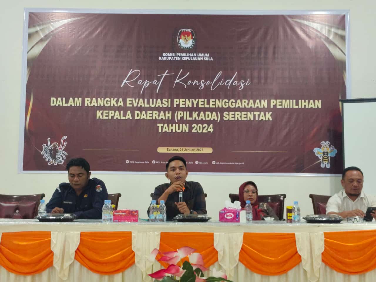 SANANA-Komisi Pemilihan Umum (KPU) Kepulauan Sula, menggelar Rapat Konsolidasi dalan rangka evaluasi penyelenggaraan Pemilihan Kepala Daerah (Pilkada) Serentak Tahun 2024.