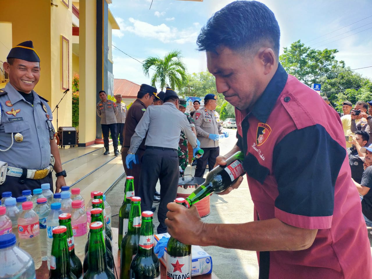 SANANA-Kepolisian Resort (Polres) Kepulauan Sula, memusnahkan ratusan barang bukti minuman keras (Miras) beralkahol jenis Bir Bintang dan Cap Tikus. Rabu, (30/2025).