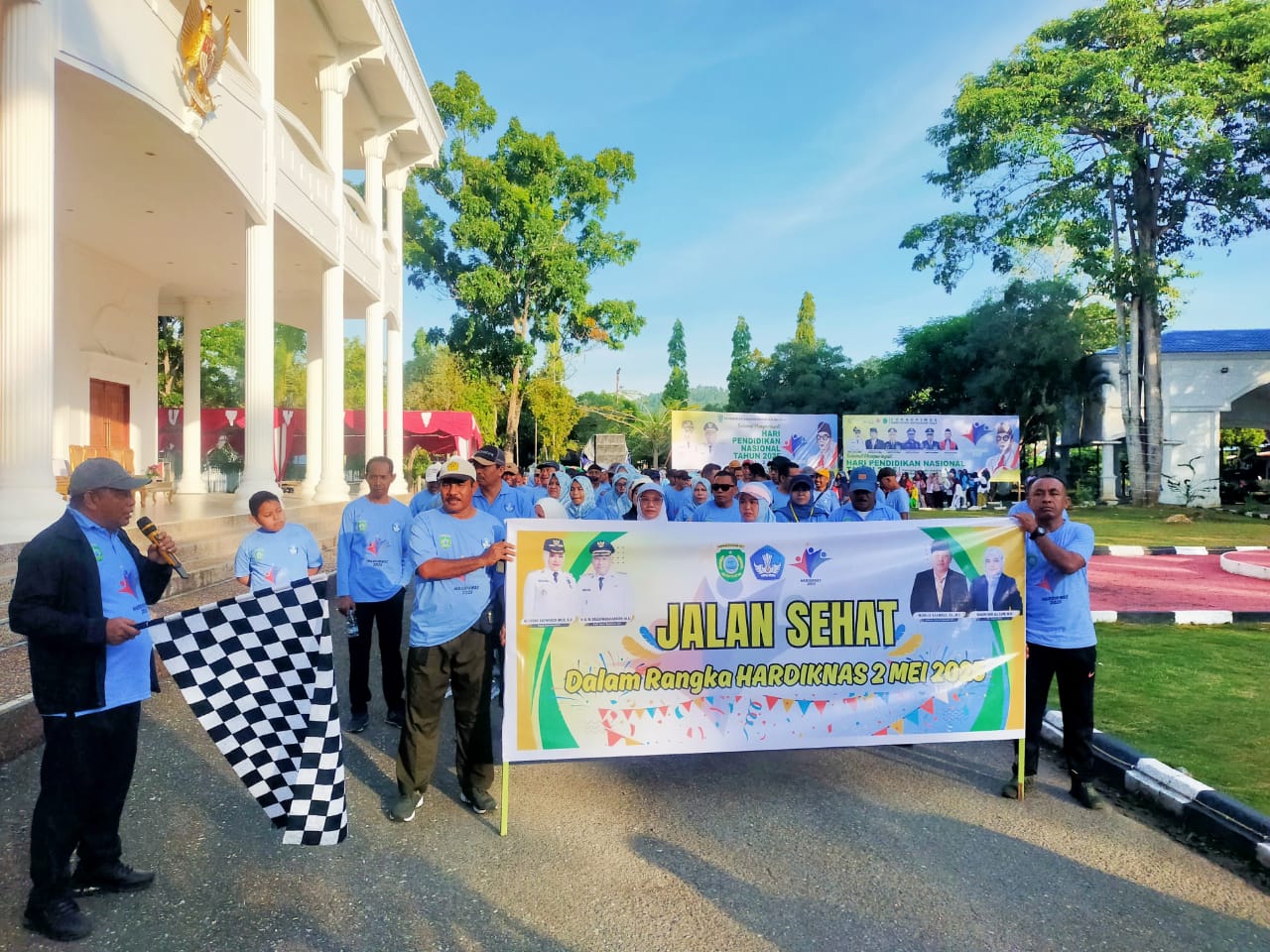 SANANA-Sekretaris Daerah (Sekda), Muhlis Soamole didampingi Pimpinan Organisasi Perangkat Daerah (OPD) bersama Guru-guru, turut berpartisipasi pada kegiatan jalan sehat yang diselenggarakan oleh Dinas Pendidikan (Disdik) Kepulauan Sula dalam rangka untuk menyambut Hari Pendikan Nasional (Hardiknas) Tahun 2025.