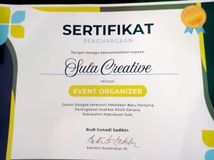 SANANA-Lembaga Sula Creative, menerima sertifikat penghargaan dari Menteri Kesehatan Republik Indonesia (Menkes RI), Budi Gunadi Sadikin sebagai Event Organizer (EO) dalam rangka seremoni peletakan batu pertama peningkatan kualitas Rumah Sakit Umum Daerah (RSUD) Sanana.